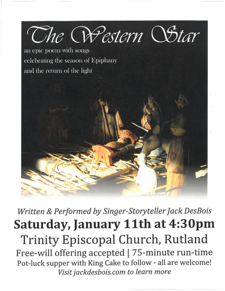 Jack DesBois is a Middlebury, VT-based actor, singer and poet dedicated to sharing joy through live performance. In addition to The Western Star, Jack’s unique solo repertoire includes V is the Valley, a conversation with the folk songs of Vermont, and Shakespeare’s Songs, a centuries-spanning exploration of the bard’s music. He also performs with Opera Company of Middlebury and the Middlebury Bach Festival, and he is a Teaching Artist for Courageous Stage’s Shakespeare, It’s Elementary literacy programs. Visit jackdesbois.com to learn more about Jack. For more information about the upcoming performance at Trinity Church, contact Wendy Grace, office@trinitychurchrutland.org; 802-775-4368.