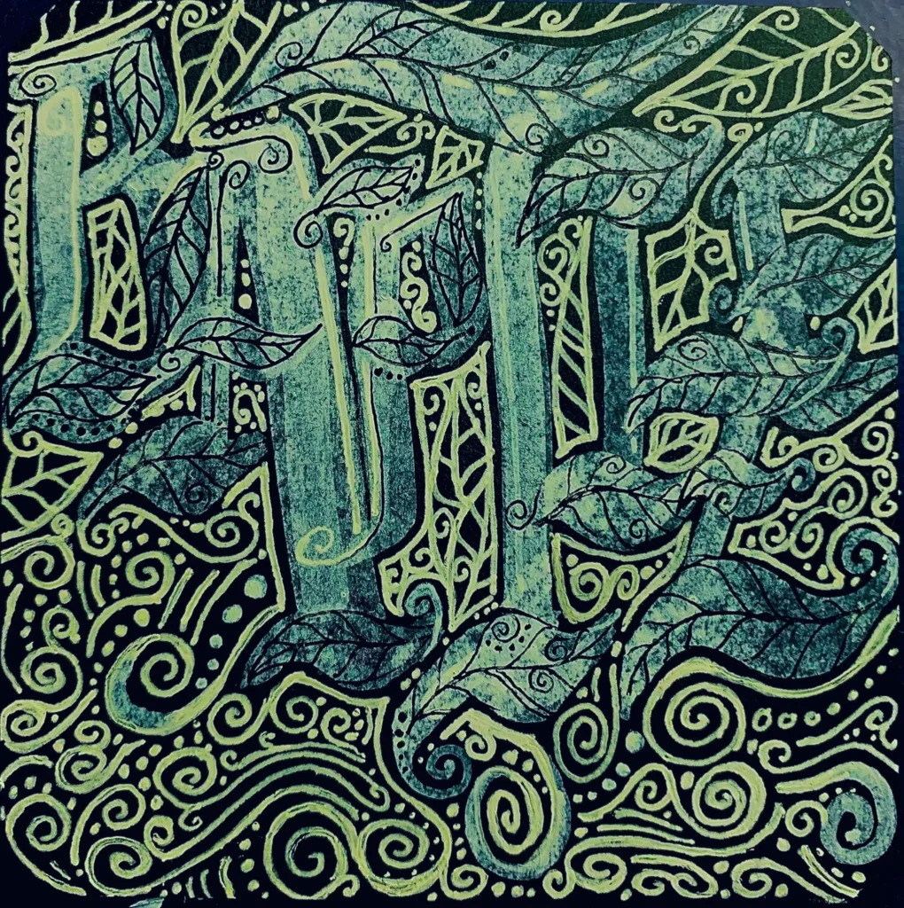 Image: The word ‘baptize‘ in artistic script in green and blue. Original artwork by Bishop Shannon
